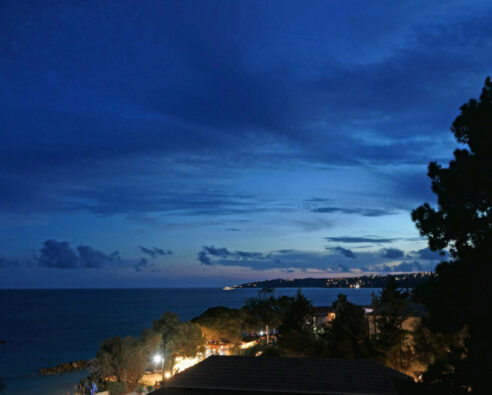 durchs offenstehende Fenster ins blauschwarze Dunkel.