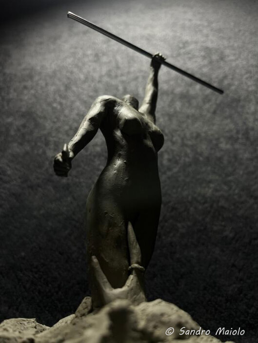 Sandro Maiolo, geboren 2001, lebt und arbeitet in Augsburg. Er interessiert sich in seiner künstlerischen Arbeit besonders für Skulpturen. Ein Schlüsselerlebnis war für ihn, als er 2020 während Corona in der Galleria dell‘Accademia in Florenz den „David“ von Michelangelo sah. Auch „Die Entführung der Persephone“ von Lorenzo Bernini hat ihn geprägt. Ins Dreidimensionale zu denken und hartes Material lebendig und weich aussehen zu lassen, fasziniert ihn genauso wie die griechische Mythologie und die literarischen Werke und Welten von Tolkien, die er in seinem künstlerischen Schaffen verarbeitet.